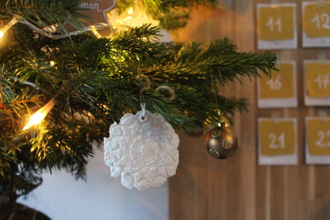 Recommencez autant de fois que nécessaire. Essayer avec un grand napperon et sélectionner qu’une ou deux partie en fonction du résultat, utilisez des emporte pièce. J’ai même essayer avec du houx mais je n’étais pas tellement satisfaite… Bref, amusez-vous et essayez !La seule obligation est de pas oublier de faire un trou à l’aide d’un cure-dent ,il servira à attacher vos suspensions. Laissez sécher et cuisez selon les indications de votre recette de pâte à sel.