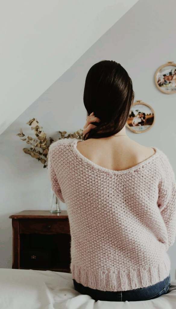 A la foire St Michel de Brest, Chez Annette, je suis tombée sur 3 magnifiques pelotes de laine. C’est le rose qui m’a plu (moi qui n’aime pas tellement cette couleur d’habitude). Elle est tellement douce et chaude… Au départ, je voulais faire une couverture ou un pull pour bébé. Et puis, je me suis rendue compte que je ne tricotais jamais pour moi. J’ai donc choisi de tricoter mon premier pull. Je n’ai pas trouvé de tutoriel gratuit qui me plaisait. Et petit à petit, j’ai commencé à imaginer mon pull. Je voulais un pull long ( petite déception il est plus court que ce que j’avais imaginé) pour me lover dedans cet hiver. Des manches ballons, mais pas trop, un col rond devant et échancré derrière. Et là… une folie, l’impression que tout était possible, j’ai eu une bouffée de confiance en moi, je ne sais pas… j’ai décidé de me faire mon pull sans suivre de patron ! Et je l’ai fait ! Enfin…après avoir commandé de nouvelles pelotes car, non 3 pelotes ne suffisent pas…