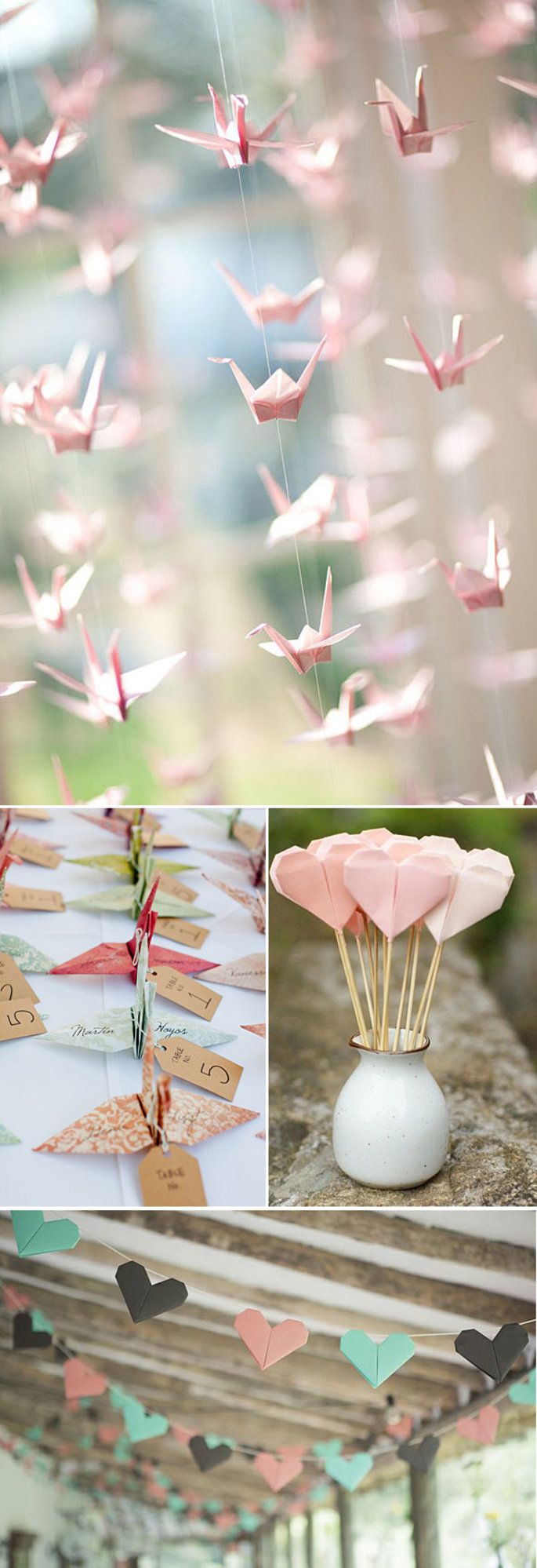 Les guirlandes: de papiers ou de tissus, en fanions, en origamis… Sur un mur au-dessus d’une table, sur une poutre, sur des fenêtres, le long des tables… Laissez- les courir au grè de votre créativité. Choisissez- les aux couleurs du mariage et/ou du lieu.
